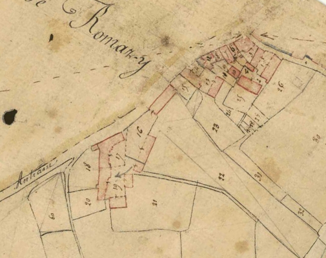 Commune de Romazy. Section A de l'Eglise, dessin, échelle 1/2500, Chalette Jules géomètre, 11 juin 1828 (A.D. 35).