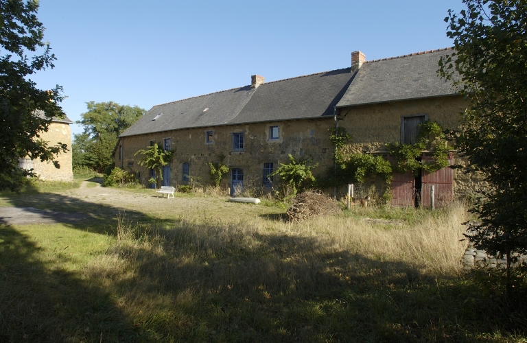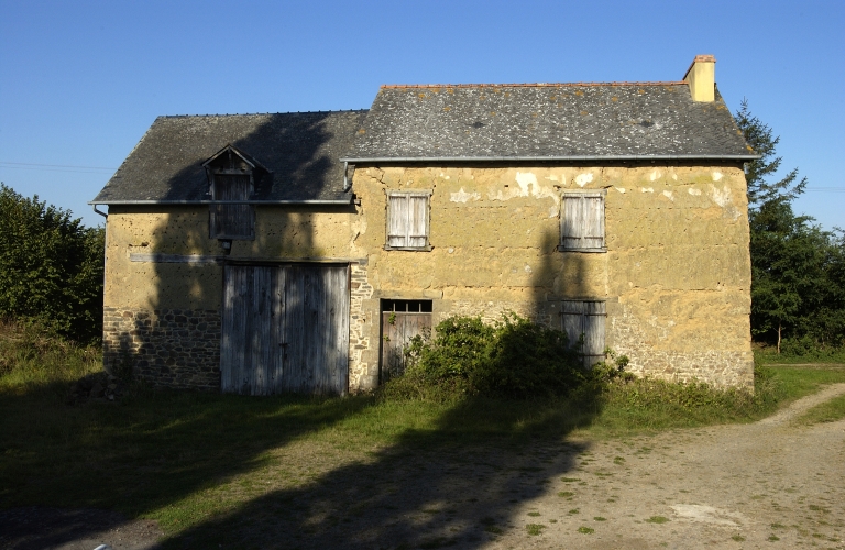 Ferme composée de deux bâtiments perpendiculaires et d'un puits au sud-ouest. Premier bâtiment orienté nord-ouest/sud-est ; plan en alignement ; appentis latéral sur côté gauche. Gros oeuvre en terre sur solin de grès et de granite. Comble à haut surcroît ; portes hautes. Encadrements des ouvertures en pierre de taille de granite ou à carrées de bois doubles (légèrement cintrées dans corps central). Long pan prolongé dans partie droite alignement. Second bâtiment composé de deux corps juxtaposés (logis et grange) construit en terre sur un solin de grès et de granite. Comble à haut surcroît ; portes hautes et portes hautes pendantes. Encadrements des ouvertures à carrées de bois doubles.
