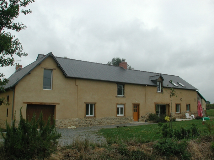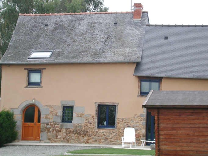 Ferme de plan en L Construite en terre enduite sur solin de granite et de grès. Corps nord : comble à surcroît. Encadrements d'ouvertures en pierre de taille de granite moulurées ; arc en accolade sur linteau de la fenêtre ; carrées de bois doubles. Toit à égout retroussé. Trois autres corps de bâtiments très remaniés.