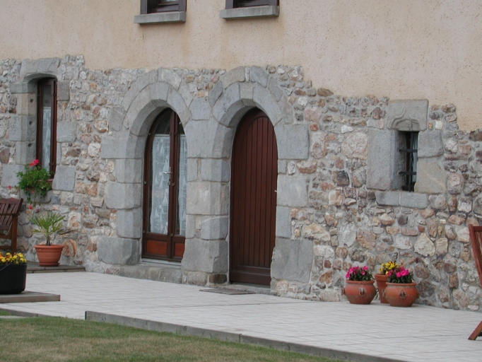 Plan allongé ; orientation est/ouest. Gros oeuvre en terre enduite sur un solin de granite et de grès. Comble à surcroît ; portes hautes. Encadrements des ouvertures en pierre de taille de granite dans la partie gauche (traces d'une ancienne grille dans la fenêtre de gauche et arc en accolade sur linteau du jour de droite) et à carrées de bois doubles (remaniées dans la partie droite).