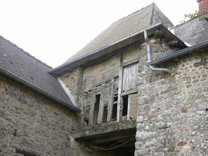 Les bâtiments de ce lieu sont construits en moellon de granite, en terre et en pan de bois. Ils forment un "U" et l'accès à la cour se fait grâce à un porche situé au nord-ouest. Ce porche est construit en pan de bois et possède une toiture à croupes en ardoise. Il est composé d'une pièce à feu dont l'accès se fait par une escalier en bois situé dans la partie nord du bâtiment fermant la cour à l'ouest. Ce porche est percé d'un arc en plein cintre au nord ; celui-ci est surmonté d'un écu.