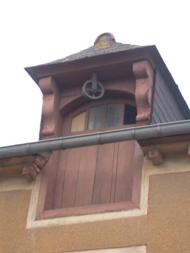 La maçonnerie de cette maison est enduite et le toit à longs pans est couvert d'ardoise. La façade est percée de trois travées de baies à encadrements de bois. La porte haute pendante centrale, percée dans le comble à surcroît, est décorée de volutes latérales en bois. De plus, elle possède encore la poulie qui permettait de monter les marchandises dans le comble.