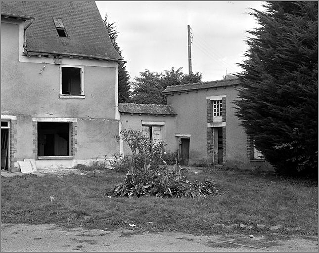 Dans l'appentis à gauche, porte et fenêtre rectangulaires et saillie du conduit de cheminée.