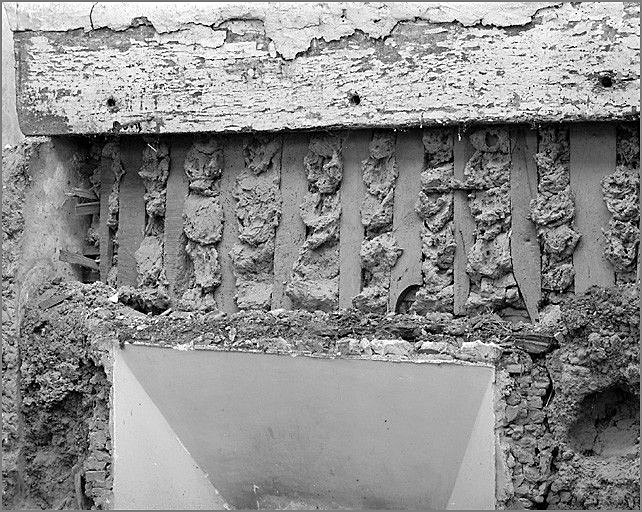 La partie gauche est ouverte d'une petite baie au rez-de-chaussée et d'un jour au 1er étage à encadrement de bois. About de la poutre de plancher en saillie par rapport au nu du mur à droite de la fenêtre du rez-de-chaussée.