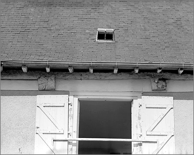Porte-fenêtre à encadrement de granite peint en blanc à linteau délardé en accolade, et surmontée d'une fenêtre à encadrement de bois. Abouts des poutres apparents (trois plus une poutre de rive) supportant une sablière sur laquelle reposent les solives (fig. 13).
