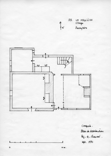 Cheminée sur le mur est encastrée dans le lambris (les placards de part et d'autre sont profonds de 0,80m). Au moment de l'enquête des éléments du lambris avaient déjà été ôtés et cela permet de démontrer que la cheminée, dans son état actuel, est le résultat d'un remaniement (réduction de la taille du foyer) (fig. 29). Au stade ultime, avant la démolition totale, la structure de la cheminée est parfaitement visible (fig. 30). Cheminée originelle hauteur 1,70m, adossée, piédroits en granite, corbeau en bois supportant une pièce de bois recevant le linteau de bois, hotte droite en tuilots. Le rétrécissement est construit en terre, tuilots et pans de bois.