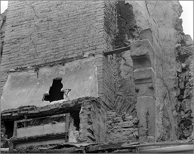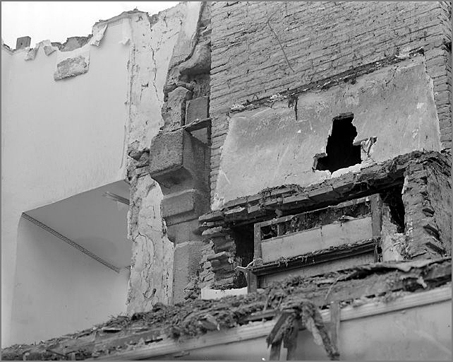 Cheminée désaxée par rapport au centre du mur, intégrée dans le revêtement. Lors de la démolition, les structures originelles sont apparues (fig. 36, 37) : piédroits appareillés en granite, chanfreinés, congés au sommet, corbeaux en talon, en granite (linteau bois disparu).