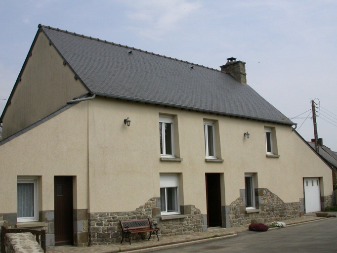 Ce bâtiment est enduit ; le solin est composé de moellon de granite. Le toit à longs pans est couvert d'ardoise et le comble à surcroît est percé de trois portes hautes qui desservent le comble. A l'ouest, de l'autre côté de la route, se trouvent l'étable et l'écurie ; ces bâtiments sont construits en terre et couverts d'ardoise.