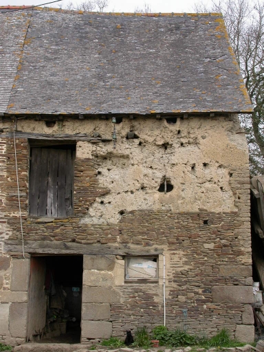 La partie est de cet alignement est construite principalement en moellon de schiste, seule la partie supérieure des murs est en terre. Les baies d'origine de cette partie possèdent des encadrements en pierre de taille de granite. La partie ouest de l'alignement est, quant à elle, élevée en terre enduite. Les deux baies du rez-de-chaussée sont insérées dans un massif de maçonnerie et possèdent un linteau filant en bois. Face à l'alignement de logis, au sud, il existe plusieurs bâtiments en terre qui abritent les dépendances, notamment une étable.