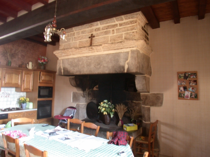 Plan en L. Logis à fonctions combinées, à trois pièces en rez-de-chaussée dont deux sont à feu. Chacune des pièces possède une distribution extérieure indépendante. La pièce de gauche semble avoir servie d'étable . Elle est surmontée d'un grenier avec porte haute extérieure. Le logis à deux pièces à feu en rez-de- chaussée est surmonté de chambres. Aile en retour d'équerre avec logement et dépendances. Marque de marchand et monogramme. Gros oeuvre en granite, pour la façade principale. Façade arrière en granite et en terre. Eléments du décor, souche de cheminées, corniche à modillons, lucarnes en calcaire du Quiou (Côtes d'Armor).
