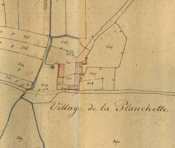 Ce qui caractérise le hameau de la Planchette, c´est son organisation actuelle à cour fermée. La présence de douves quadrangulaires, visibles sur le cadastre de 1834, à l´Ouest et au Sud peut indiquer un site ancien de manoir. Ce dernier détruit a pu également être transformé à la fin du 16e siècle ou au début du 17e siècle, en logis de retenue. Les remaniements successifs ne permettent pas aujourd´hui de se rendre compte de la disposition initiale. Le logis Est conserve toutefois de beaux vestiges de la fin du 16e siècle ou du début du 17e siècle, notamment sa structure en pan de bois sur le pignon et des ouvertures, porte et petite baie à accolade en façade arrière.