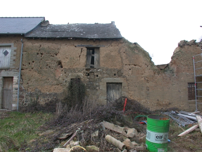 Partie centrale de l'alignement datable du 16e siècle, agrandie de deux logis à l'Ouest et à l'Est dans le courant du 19e siècle. Le logis Est porte la date de 1838 sur la souche extérieure de cheminée. La partie centrale, plus ancienne, divisée en trois pièces à feu indépendantes a subi des modifications quant à sa distribution. Ces modifications se signalent notamment par des percements de datation différente et des portes de communication murées. Il est vraisemblable que le deuxième logis possédait autrefois une chambre haute à l´étage. Cet ensemble est caractéristique de l´architecture rurale communale, par son mode d´organisation en ligne, pluri-familiale qui s´étale dans le temps, par l´emploi de matériaux mixtes, pierre et terre, et aussi par le maintien fragile de beaux éléments, cheminée, vaisselier intérieur, porte extérieure en plein cintre. Cet ensemble est actuellement en cours de restauration.