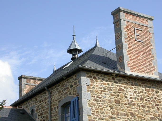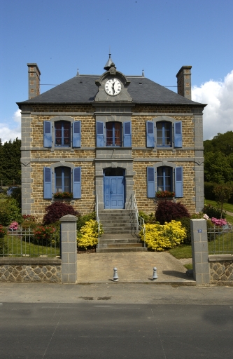 Bâtiment construit en appareil moyen de granite. Les encadrements des ouvertures, les chaînages d'angles et les bandeaux horizontaux sont en pierre de taille de granite. Le toit à croupe est orné d'épis de faîtage. Les deux souches de cheminée en brique sont ornée d'une lettre en fer forgé : E (pour école) d'un côté et M (pour mairie) de l'autre.