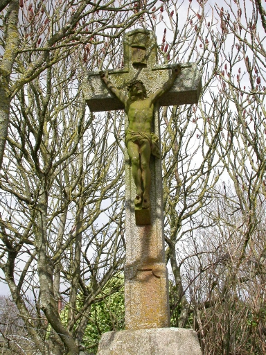 Cette croix fut érigée lors de la mission de 1932 comme l'indique une inscription. La croix en granite est ornée d'un Christ en fonte. Elle repose sur deux socles différents qui sont plus anciens. L'un d'eux est sculptés de deux visages.