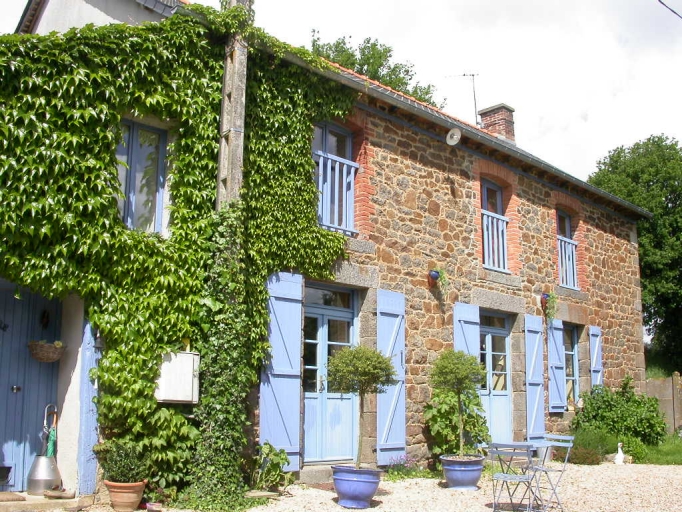 Cette ferme est construite en moellon de granite, les encadrements des baies sont en pierre de taille de granite au rez-de-chaussée et en brique à l'étage.