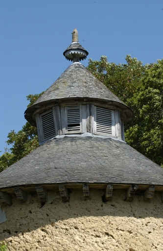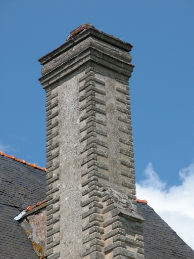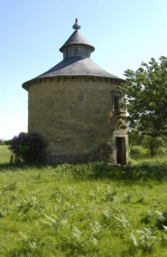 Logis en moellons de schiste enduit ; hautes souches de cheminée en faluns ; pigeonnier en maçonnerie de terre.