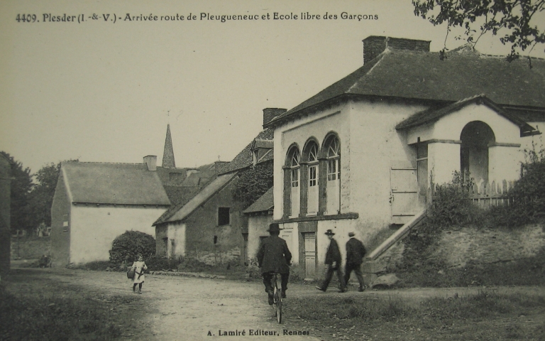 4409- Plesder (I.-&-V.) - Arrivée route de Pleugueneuc et Ecole Libre des Garçons, carte postale, A. Lamiré, Editeur, Rennes, [s.d.] (A.D. Ille-et-Vilaine : 6 Fi Plesder).