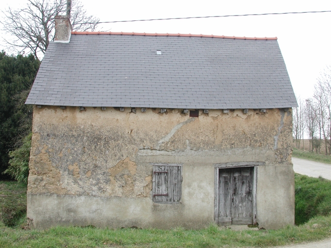 Maçonnerie en terre ; encadrements de baies en bois. Toit à longs pans ; couverture en ardoise.