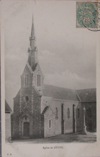 L'église construite vers la fin du 19e siècle en remplace une plus ancienne. Le 29 mai 1862, le conseil municipal décide de construire une nouvelle église et charge Aristide Tourneux, architecte des hospices civils de Rennes, d'en établir les plans. A la demande du préfet, le 18 novembre 1862, une commission d'architectes, composée de Jean-Baptiste Martenot, Aristide Tourneux et Louis-Auguste Leray, se rend à Guipel. Son rapport est alarmant : "Vu l'imminence du danger nous avons, séance tenante, prescrit à deux charpentiers de Hédé, l'exécution immédiate des travaux de consolidation ci-après détaillés. Il est à désirer de voir au plus tôt remplacer l'église actuelle qui a fait son temps." Le 17 mars 1865, les travaux de construction de la nouvelle église commencent. Le chantier s'achèvera en 1878 par la construction de la tour de l'église, sous la direction de l'architecte Laloy, après le décès d'Aristide Tourneux.