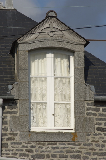 La maçonnerie de ce bâtiment est composée de moellon de granite ; le toit à croupes est couvert d'ardoise, il est surmonté d'épis de faîtage et d'une crête de toit. Le solin de la maison est réalisé en moellon à tête dressée de granite ; les encadrements de baies, les chaînages d'angle, les bandeaux sont quant à eux en pierre de taille. La façade sur rue est percée de trois travées, la baie centrale de l'étage possède un balcon en fer forgé. Les anses des tirants métalliques forment la lettre "D" sur les deux souches de cheminée. Les trois portes hautes pendantes possèdent des linteaux en granite cintrés surmontés de frontons en bois décorés de trilobes, de coeurs.