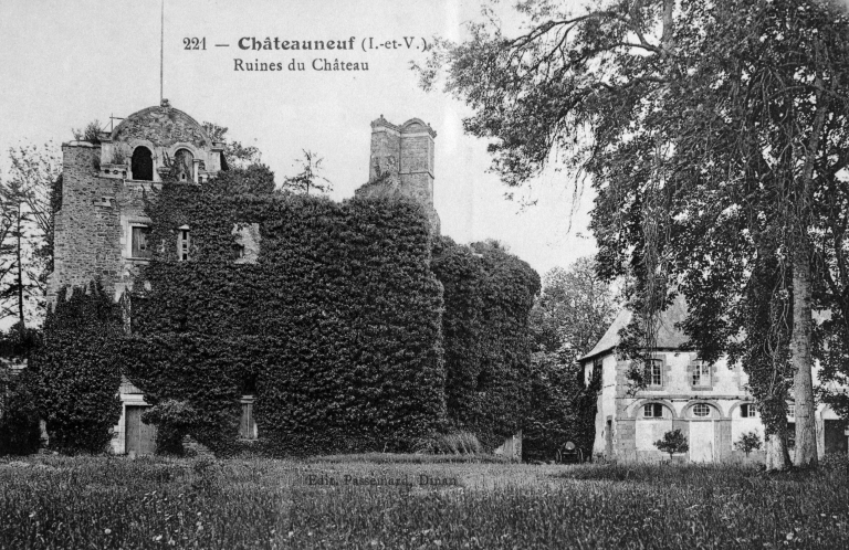 Le vieux Château en partie détruit de Châteauneuf et un bâtiment du nouveau Château. Carte postale, tirage photographique, éditions du Château, [s. d.] (A.D. Ille-et-Vilaine 6 Fi13).