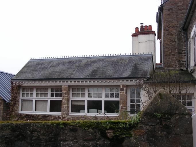 Ce bâtiment est élevé en moellon de granite et de schiste ; sa façade sur rue est recouverte d'un enduit en ciment. La partie centrale du toit forme un petit pavillon. Perpendiculairement au logis, à l'arrière, se trouve une construction en moellon de granite possédant un toit en ardoise surmonté d'une crête en zinc ornée de motif de trilobes.
