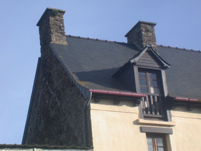 Plan rectangulaire à étage. Pignon pentu. Présence de trois souches de cheminées. Chambre à l'étage. Fenête ancienne sur le pignon est. Elévation très remaniée. Orientation sud sur la cour. A noter : inscription : LES LANDES ROUXEL sur un linteau de fenêtre du rez-de-chaussée.