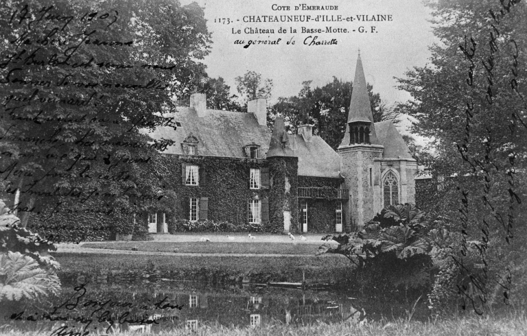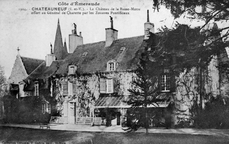 Côte d'Emeraude - 1904 - CHATEAUNEUF (I.-et-V.) - Le Château de la Basse-Motte offert au Général de Charrette par les Zouaves Pontificaux. Carte postale, collection Germain, Saint-Malo [s. d.] (A.D. Ille-et-Vilaine 6 Fi).