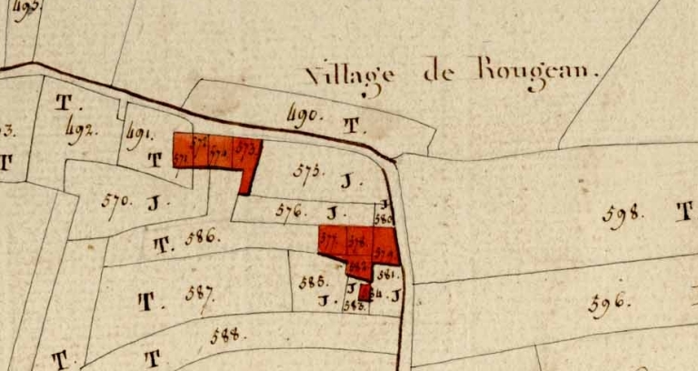 Cet écart existait déjà lors de la réalisation du premier cadastre de la commune en 1809 et s´appelait : « Village de Rougean ». Les parcelles bâties en 1809 sont identiques à celles où sont représentés des bâtiments sur le deuxième cadastre de la commune, daté de 1848. Cet écart se composait de deux alignements de quatre logis chacun. Actuellement, les bâtiments anciens sont encore tous existants cependant ils sont très remaniés. Des constructions neuves, datant de la 2e moitié du 20e siècle, sont venues développer considérablement l'écart.