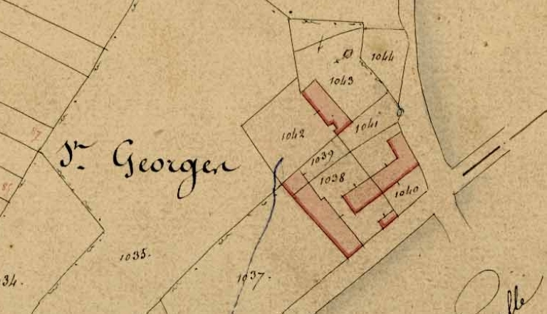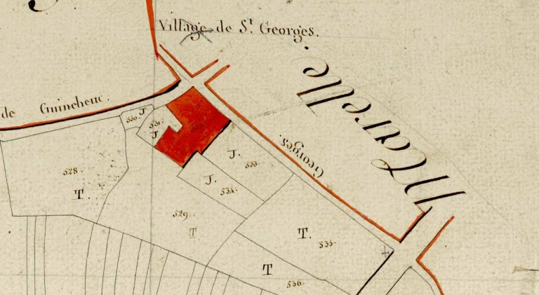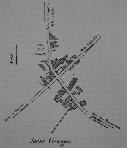 Cet écart existait déjà lors de la réalisation du premier cadastre de la commune en 1809 et s´appelait : « Village de Saint-Geroges ». Les parcelles bâties en 1809 sont, à quelques exceptions près, identiques à celles où sont représentés des bâtiments sur le deuxième cadastre de la commune, daté de 1848. De nombreux bâtiments figurés sur les deux premiers cadastres existent toujours. Quelques bâtiments ont été reconstruits à la fin du 19e ou au début du 20e siècle à l´emplacement d´anciens bâtiments et plusieurs ont également été remaniés à cette époque. Quelques constructions neuves, datant de la 2e moitié du 20e siècle, sont venues développer l'écart. Cet écart possédait une chapelle frairienne, actuellement détruite, et d´après la tradition orale deux cafés-épiceries. Dans son ouvrage sur la commune de Saint-Père-Marc-en-Poulet, datant du début du 20e siècle, Théodore Chalmel les mentionne. La chapelle est décrite en ces termes : « La chapelle de Saint-Georges se trouvait sur le bord de l'ancien chemin conduisant aux Chênes, au nord de la fontaine, derrière la propriété Leduc. Elle mesurait trente pieds de longueur et vingt de largeur. Un petit placître triangulaire en précédait l'entrée, au midi, et contenait une corde et demie. On n'en voit plus aucune trace. Seuls, les noms ont survécu. Le pâtis sur lequel s'élevait l'édicule s'appelle encore : Le Clos de la Chapelle, et le village qui s'est développé tout autour porte le nom du Saint auquel elle était dédiée : Saint Georges. A l'origine, cette chapelle, comme celle des Gastines, était frairienne, c'est-à-dire entretenue par les habitants du lieu, et fondée d'une messe, tous les dimanches. ». Quant à l´écart et à ses commerces, Théodore Chalmel les mentionne ainsi : « Avec ses écarts (Rougent, Drouette, La Marelle, Les Besnardais), ce quartier populeux compte quatre-vingts maisons et trois cents habitants. La petite industrie y est représentée par un maréchal, un vannier, un fournier ; le commerce, par trois épiciers, autant de débits de boissons, un marchand de fourrage. Au cours de la période révolutionnaire, le nom perdit sa particule et on lui ajouta ces deux mots : du Poulet pour obtenir : Georges-du-Poulet. ».