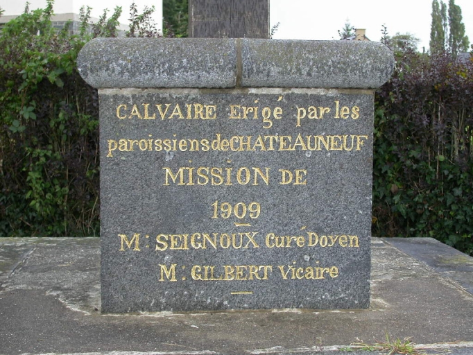 La croix, en bois, porte un Christ en fonte peint. Le socle est en granite. Sur le socle se trouve une inscription : CALVAIRE Erigé par les / paroissiens de CHATEAUNEUF / MISSION DE / 1909 / M : SEIGNOUX Curé Doyen / M : GILBERT Vicaire. Sur une contremarche est gravée cette inscription : MISSIONS 1949 et 1957 / RESTAURE EN 1994.