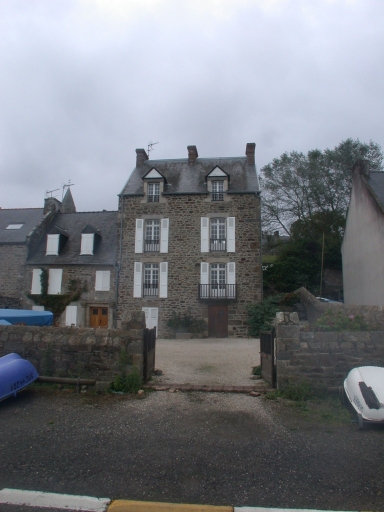 En front de mer. En contrebas de la falaise. Parcelle allongée avec cour fermée. Maison en partie mitoyenne. Deux étages surmontés d'un étage de comble. Façade ordonnancée à deux travées. Façade principale orientée ouest.