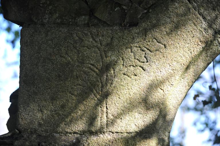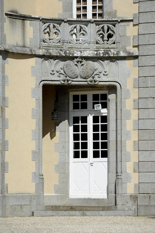 Sur l'arrière du château, le grand bâtiment des communs garde des traces d'une entrée et d'une fenêtre sculptées au 17e siècle.
