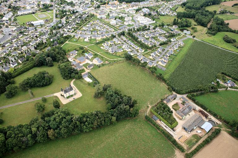 Orain écrit : 'On aperçoit près du bourg, sur la route de l'Hermitage, dans une jolie situation, un charmant château moderne, flanqué de deux tourelles. C'est la demeure de M. de Farcy, maire de Mordelles, conseiller général du canton'. L'édifice peut stylistiquement être daté de la 2e moitié du 19e siècle, et plus probablement du 3e quart ; il est à rapprocher des châteaux construits par Jacques Mellet dans les années 1860. Il a été construit sur le site d'un ancien manoir dont les ruines sont identifiables au sud du château.