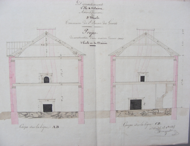 A. D. Ille-et-Vilaine. Série O : Administration et comptabilité communales. Edifices publics. Monuments et établissements publics. Ecoles : dossier de projet de construction d'une maison d'école et mairie, d'agrandissement de l'école des garçons, d'acquisition d'une maison d'école des filles (1845-1905) : 2 O 286/19.