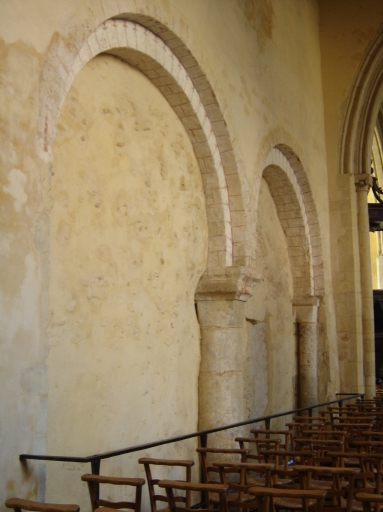 Les éléments les plus anciens de la construction, mis au jour par les fouilles archéologiques, sont situés aujourd´hui sur le mur gouttereau sud de la nef actuelle. A l´Ouest, une double arcade en plein-cintre à double rouleau repose au centre sur une colonne surmontée d´un épais tailloir et aux extrémités sur des demies-colonnes engagées. Dans l´axe, au-dessus de chaque arc sous l´actuelle charpente est percé un oculus. Au-delà de cette double arcade, à l´Est, le niveau du sol est surhaussé. On trouve à la suite, percée en hauteur dans le mur, une ouverture assez large en arc plein-cintre à double rouleau qui pourrait correspondre non pas à une baie mais davantage à un accès communiquant entre l´église abbatiale et les bâtiments monastiques qui pouvaient lui être accolés.