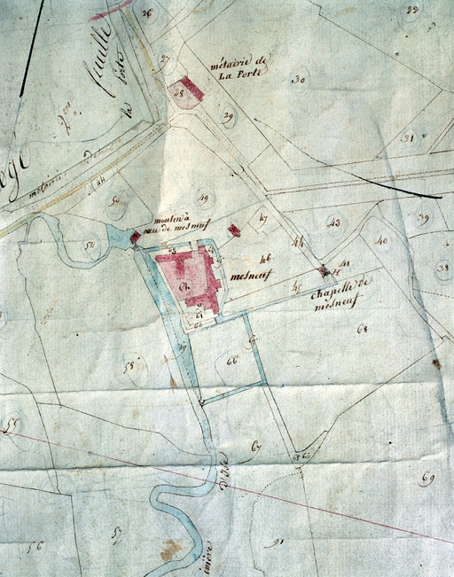 Lieu d'habitation à usage agricole au 14e siècle, il était maison forte. L'organisation du manoir est simple : un corps de logis, habitation du maître, avec salle haute de réception et quelques logements à l'étage, desservis par une tour. Au rez-de-chaussée, se trouvait la salle basse ou commune, communiquant avec l'office et la cuisine. Les repas étaient préparés dans la grande cheminée. Les bâtiments de la retenue se trouvait dans l'enceinte fortifiée avec four, granges, étables. Accolés aux bâtiments se trouvait le colombier. Les bâtiments qui composent le manoir forment un quadrilatère presque parfait. A l'ouest, une petite rivière, l'Ise, sert de défense et approvisionne les douves, qui bordent les trois autres côtés. Il avait une poterne d'entrée avec pont-levis et trois tourelles dont une est le colombier jouxtant la poterne. Une tour est à usage d'escalier à vis et marches en bois. La salle haute et la salle basse occupent la partie centrale du bâtiment et sont ouvertes au nord et au sud. Un puits intérieur aliment l'ensemble. Le petit jardin se trouve au sud, entouré de douves profondes. Le grand jardin s'étend vers l'est et rejoint la chapelle. La boulangerie au nord-est, est d'une taille assez remarquable. Quant au moulin, il fonctionnait grâce à une rivière, qui a été en partie canalisée pour faire fonctionner la roue. Le tout permettait une vie en autarcie en cas de trouble ou de conflit. En-dessous du déversoir du moulin, s'étendait l'étang à usage de vivier à poissons et pêcherie. Les terres dépendantes de Mesneuf s'étendaient sur six communes. Depuis le 14e siècle, date de sa construction, il fut remanié et agrandi à plusieurs reprises jusqu'au 18e siècle et en partie mutilé au 19e siècle. Mesneuf était qualifié de châtellenie et possédait un droit de haute justice et un colombier. Le manoir relevait de la châtellenie de Bourgbarré. Il était aux de Pan en 1427, passa par alliance aux du Bouays qui l'avaient en 1513, et par alliance aux de Montbourcher seigneurs du Bordage qui l'avaient en 1604, et le vendirent en 1615 aux du Bouays ; il passa par succession vers 1754 aux le Maistre seigneurs de la Garlaye qui le vendirent en 1781 aux de la Motte seigneurs de Beaumanoir.