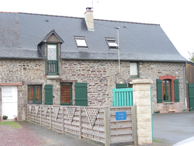 Ferme construite en moellon de schiste. Les encadrements des ouvertures sont en brique ou ont seulement un linteau en bois. La pente du toit est brisée par un coyau.