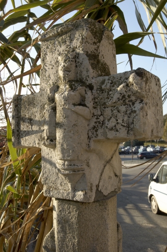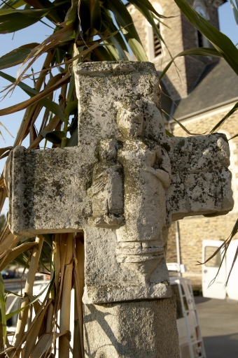 Croix en trois parties, le socle, la hampe et la croix. Socle polygonal en granite. Hampe de section également polygonale avec décor rampant de feuilles. Croix latine avec christ en croix sur la partie face et une vierge à l'enfant sur la partie revers. Les sculptures de la croix sont abîmées.
