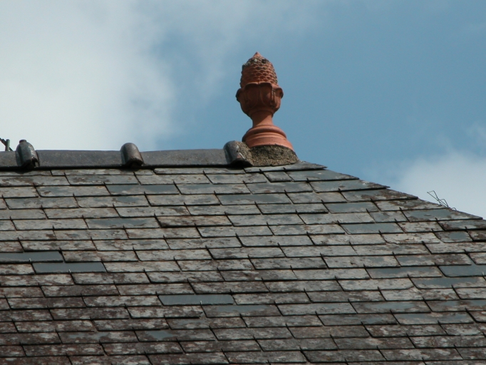 Implantation à l'aplomb de la rue. Plan rectangulaire à étage. Toiture à longs pans et croupe. Epis de faîtage en terre cuite.