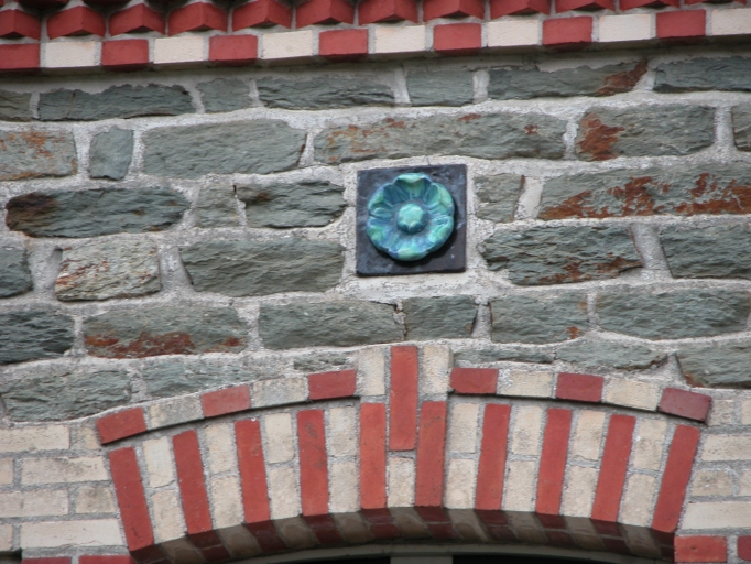 Implantation parallèle et en retrait de la rue. Cour antérieure et jardin arrière. Rez-de-chaussée surélevé. A deux pièces à feu. Cabochons de grès vernissés à motifs floraux.