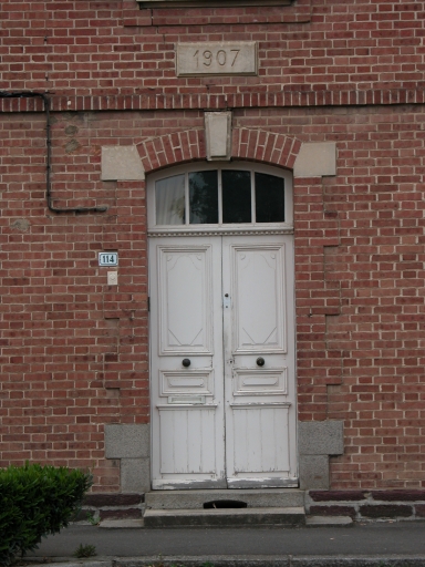 Implantation à l'aplomb de la rue. Maison de type ternaire. Façade en brique. Les encadrements des baies sont mixtes en brique et calcaire. Toiture à longs pans et croupe. A noter : initiales D et B sur souches de cheminée. Epis de faîtage en zinc. Enclos bien conservé ainsi qu'une dépendance en terre recouverte d'un enduit.