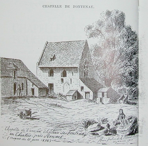 Des familles puissantes de l'entourage du duc de Bretagne : L'acte de fondation de la seigneurie de Fontenay n'est pas connu, elle apparaît dans les sources en 1148 et appartient à Thomas de Fontenay, époux d'Agnès de Vitré. Les seigneurs de Fontenay deviennent très tôt des personnages puissants. En 1294, Alain de Fontenay doit, pour sa terre, un chevalier à l'ost ducal. C'est à la fin du 14e siècle que la seigneurie atteint son apogée. En 1379, Amaury de Fontenay est « capitaine et maréchal », chargé de la garde du château et de la ville de Rennes. Il est signataire, en 1381, du second traité de Guérande qui met fin à la Guerre de Succession en Bretagne. Il obtient du duc Jean IV, en 1383, une pension à vie de 200 livres et est nommé chambellan de ce même duc avant 1386. Son fils Amaury lui succède probablement dans ces charges sous Jean V. Le domaine de la seigneurie de Fontenay était composé outre le logis seigneurial et sa basse cour, des métairies du Marais et de la Retenue, de deux moulins à eau des Bois de la Seiche et de Teslé (ce dernier en Saint-Erblon), du moulin à vent de Fleury en Noyal-sur-Seiche, de l'étang de Teslé, et de l'hôtel de Fontenay à Rennes, rue du Four-du-Chapitre. Leurs droits féodaux leurs permettaient de tenir foires et marchés au village de la Poterie, et au bourg de Noyal-sur-Seiche, de nommer et révoquer l'instituteur chargé d'instruire les enfants de la paroisse, de prélever une pièce de poterie, sur chaque fournée ou journée. Le mercredi des cendres, ils élisaient une commission composée de deux prévôts et de quatre maîtres potiers qui surveillaient notamment les fournées et divers autres droits. Des dignitaires de hauts rangs sont également venus à Fontenay et rendent compte de la notoriété du lieu et de ses propriétaires. Le 15 août 1532, le château reçoit le dauphin François III qui vient de se faire couronner duc de Bretagne, en 1593 le duc de Mercoeur s'y arrête, puis le 8 mai 1598 le roi Henri IV y passe une nuit avec toute sa famille et enfin Louis XIII en août 1626 y restera trois jours. Le château de Fontenay : La dernière mention de la motte et du château de Fontenay remonte à 1751, il s'agit d'un aveu donné au roi par Charles de Morant. « La motte ou estoit cy devant basti le chasteau de Fontenay avec la cour devant, le puits au milieu d'icelle autour de laquelle sont des maisons servantes de logement au métayer, basties de pierre, couvertes d'ardoise, la chapelle au coin de la cour, à laquelle il ne reste que les murailles et peu de couverture, autre cour et depost au devant, le tout cerné de fossés, le verger ou pépinière avec le jardin, le tout contenant six journaux ». La motte n'est plus représentée sur le cadastre de 1812, par contre une partie des douves et un vivier sont encore en place ainsi que la plupart des bâtiments qui entourent la cour. Un chemin la traverse et contourne la chapelle, située dans l'angle nord-ouest. Quant au château de Fontenay, il a été reconstruit à la fin du 14e siècle ou dans la première moitié du 15e siècle. Une partie de ce logis seigneurial est encore en place et se distingue, à l'ouest de la cour, par deux cheminées monumentales dont les hottes se dressent au-dessus du mur gouttereau. Leurs formes pyramidales sont un des traits les plus marquants des cheminées des logis de la première moitié du 15e siècle. Ces cheminées monumentales étaient placées généralement dans des pièces sous charpente. Deux autres logis à salle basse charpente ont par ailleurs été recensés sur la commune à la Retenue et à la Conterie. Il est difficile aujourd'hui d'appréhender l'élévation de ce logis qui a été très transformé et amputé d'une partie. Des étables sont aménagées au 19e siècle dans le prolongement de la grande salle. Les dépendances : Les dépendances qui encadrent la cour à l'est sont mentionnées sur le cadastre de 1812. Le chaînage de l'angle de la remise actuelle est réalisé à partir d'anciennes pierres dont une partie de colonne de la période antique. Fontenay était situé à proximité de la voie romaine de Rennes à Nantes et on sait par ailleurs que Chartres était considéré comme le centre du pagus carnutenus. La chapelle : La chapelle dédiée à saint-Aubin est le plus ancien édifice de la commune. Au 12e siècle, la paroisse s'appelait Fontenay et avait vraisemblablement pour église cet ancien édifice. Celui-ci de dimension modeste se compose d'une simple nef à chevet droit. Sa construction n'est pas homogène et différentes campagnes sont encore perceptibles. Un appareil régulier de petites pierres cubiques à plusieurs endroits du soubassement indique une construction probablement romane ou du haut Moyen Age. La baie du chevet et une niche crédence intérieure témoignent d'une reconstruction dans le courant du 14e siècle. La charpente quant à elle, semble dater du 15e siècle, elle a été modifiée lors de l'installation du retable au 17e siècle contre le mur du chevet. Un plancher masque aujourd'hui l'élévation de ce beau mobilier en pierre de taille de calcaire, qui était autrefois recouvert de polychromie. Le tableau central, dont il ne subsiste que le cadre est entouré de guirlandes, pilastres et colonnes corinthiennes. Au centre du tableau, une inscription à la gloire de Dieu : SOLI DEO GLORIA se lie encore. Quant aux nombreuses baies en plein-cintre dont une partie sont aujourd'hui murées qui éclairaient largement ce vaisseau unique, elles sont de cette période faste de réaménagement du sanctuaire. Aujourd'hui déclassée en dépendance, la chapelle est inscrite depuis le 11 avril 1975 à l'Inventaire supplémentaire des Monuments historiques. Des fragments de peintures murales sont encore perceptibles au revers de l´élévation ouest, ils pourraient remonter à la période médiévale. Le logis neuf : Suite aux dommages de guerre, un nouveau logis de la 