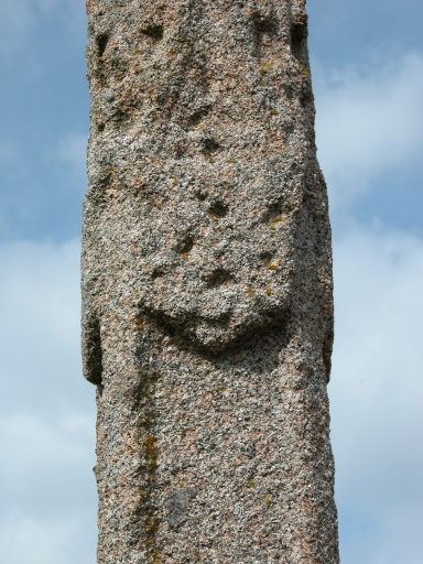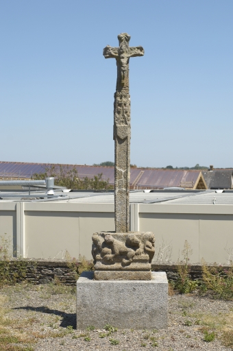 Croix déposée dans l'ancien enclos paroissial. Cette croix de granite présente un décor sculpté de style gothique flamboyant. Face : christ sculpté en ronde-bosse, revers : Vierge à l'enfant. Hampe de la croix, blasons armoriés non lisibles, avec décors de gâbles flamboyants. Les armoiries ont été identifiées comme étant de la famille Gouicquet. Socle octogonal avec des singes sculptés en ronde-bosse. Ces singes au nombre de 7 pourraient symboliser les sept péchés capitaux.