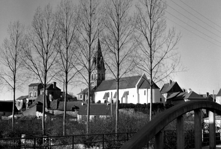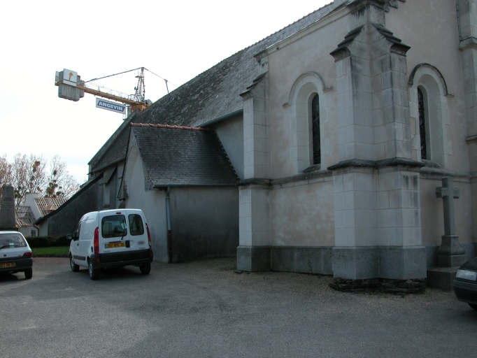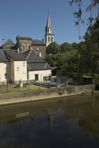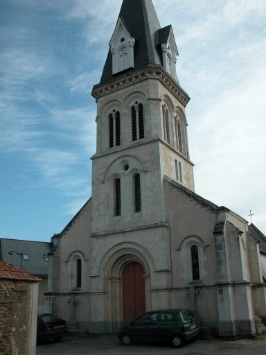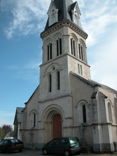 L'église autrefois dédiée à saint Melaine est actuellement sous le vocable de saint Léonard. Elle conserve sous le choeur une crypte très ancienne. De la période romane subsistent le choeur et une partie de la nef. Cette dernière ayant été agrandie au 15e ou 16e siècle. La sacristie date peut-être du 18e siècle. Le clocher-porche est une construction de l'architecte Béziers-Lafosse, projeté en 1869 il fut réalisé en 1870 (date portée). L'ensemble de l'édifice a été remanié en 1930 (date portée). Les parties romanes sont aujourd'hui masquées par un enduit.