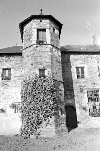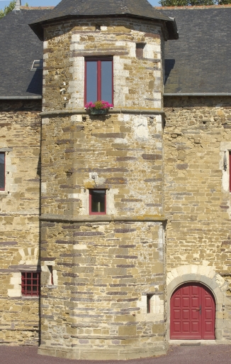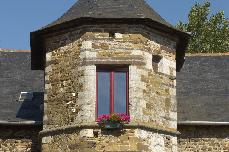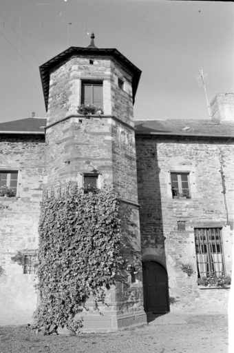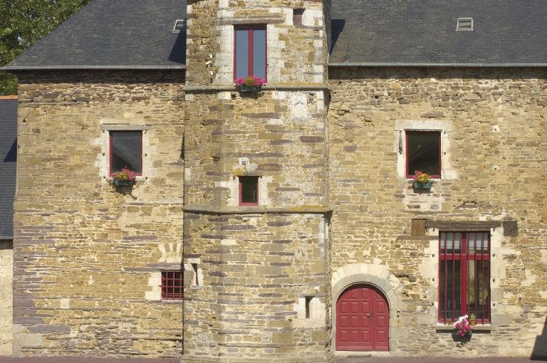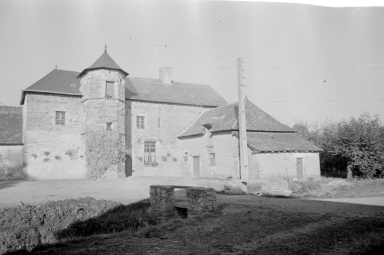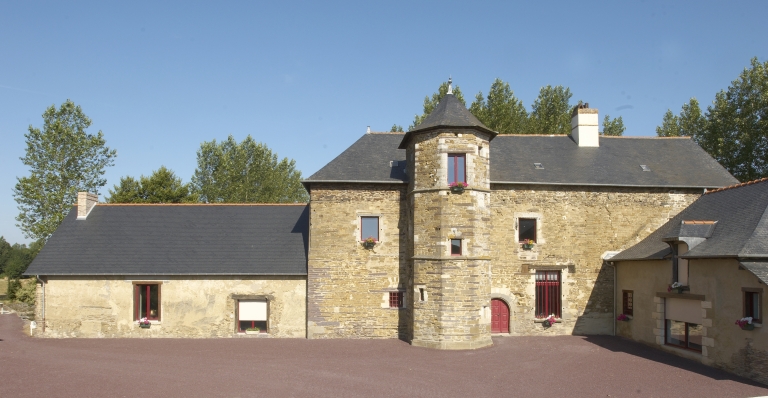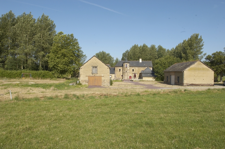 Orientation est. Manoir de plan rectangulaire avec escalier en vis hors oeuvre sur élévation antérieure, composé de trois pièces en rez-de-chaussée, cellier, salle et cuisine. Présence d'au moins deux chambres avec cheminées à l'étage. Le gros oeuvre présente une maçonnerie mixte de moellons Des annexes se sont greffées au corps principal du logis, dans l'alignement un atelier de chanvre puis à bâtiment à usage agricole en retour d'équerre sur la cour. Des étables et une grange séparées sont construites en bauge postérieurement au cadastre ancien.