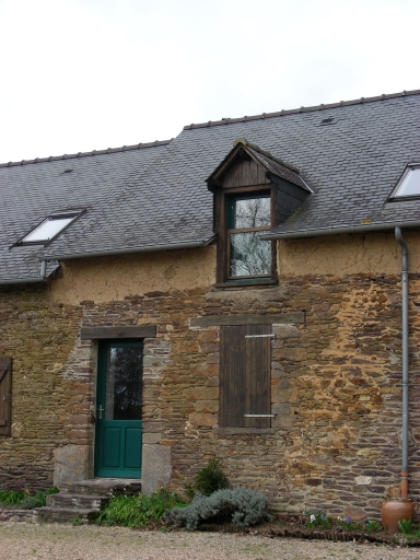 Ce lieu est composé de deux corps de bâtiment perpendiculaires l'un par rapport à l'autre. Le bâtiment situé au sud-ouest est construit en moellon de schiste pourpre principalement, cependant la partie haute des murs est réalisée en bauge. Le toit à longs pans de ce bâtiment est couvert d'ardoise. Des portes hautes pendantes donnent accès au comble à surcroît. Le bâtiment situé au nord de la cour est également élevé en moellon de schiste pourpre et en terre. Les encadrements de baies sont réalisés en brique et les linteaux en bois.