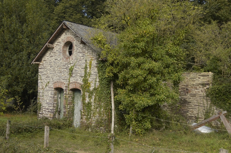 Ce bâtiment est construit en moellon de schiste, il possède par ailleurs un toit à longs pans couvert d'ardoise. Les encadrements des baies de la façade est sont réalisés en brique. Une porte haute pendante centrale dessert le comble à surcroît.
