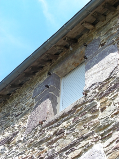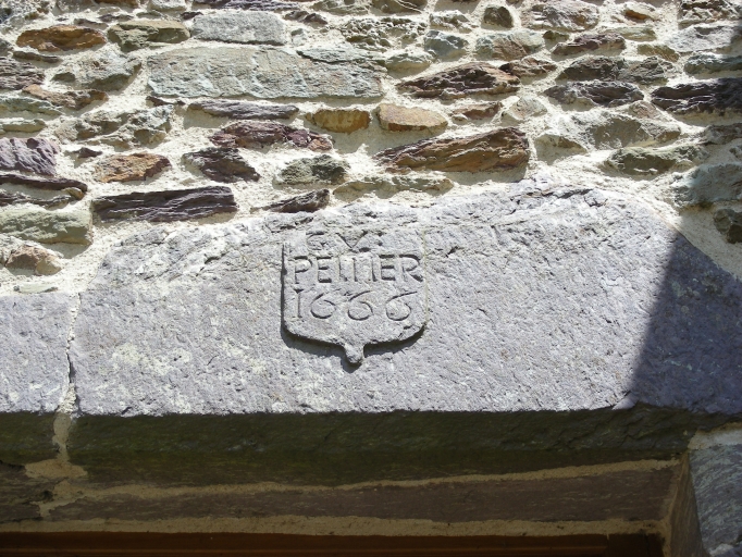 Ce bâtiment présente un plan en "L" ; la façade principale du bâtiment est orientée au sud, alors qu'une autre aile, perpendiculaire à la première, existe au nord de la construction. Le gros-oeuvre de ce bâtiment est composé de moellon de schiste, pourpre principalement. La toiture est couverte d'un matériau synthétique. En façade sud, les baies présentent des encadrements en schiste et des linteaux en bois ; deux portes hautes pendantes desservent le comble à surcroît. La façade principale de la partie nord, perpendiculaire à la première, se trouve à l'ouest. En façade ouest, il existe donc plusieurs baies dont les encadrements sont réalisés en pierre de taille de schiste pourpre. Le linteau de la porte est sculpté d'un écu, dans lequel se trouve l'inscription suivante : GV (ou U) : /PELTIER/1666. L'encadrement de la fenêtre de l'étage a conservé les ferrures d'une ancienne grille. Au sud-est du bâtiment principal, s'élève un bâtiment construit en moellon de schiste et en terre et couvert d'un long pan en ardoise. Il s'agit d'un ancien fournil et d'une ancienne grange.