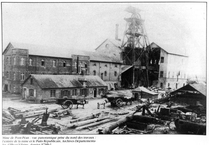 Mine de Pont-Péan : vue panoramique prise du nord des travaux : l'entrée de la mine et le Puits Républicain .[s.d.], (A.D. Ille-et-Vilaine, 9M18).